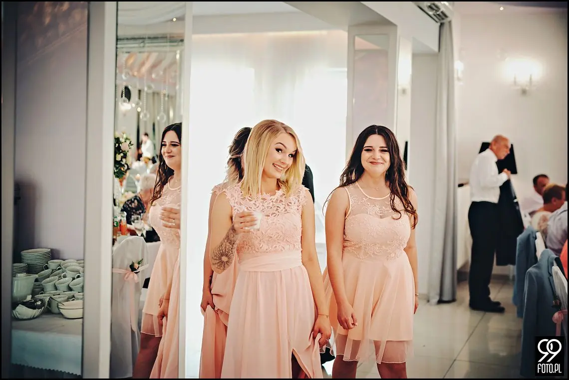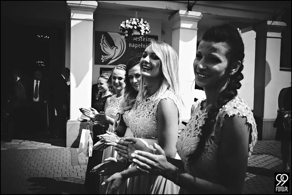 Duży dom, profesjonalna fryzjerka i makijażystka oraz niezastąpieni pomocnicy pełni humoru, plus kilka czelendżing tasków i klimat pod przygotowania mamy zapewniony. Tak w dużym skrócie mógłbym przedstawić początek piątkowych przygotowań Magdy, które miały miejsce w Skawinie. Przed dwunastą kiedy już fryzura i makijaż były gotowe, a na mojej karcie pamięci w aparacie zapisany finalny look, wybraliśmy się do Piotrka. Miało być tam kilku ziomków i spoko klimat... i tak właśnie było. Drużbowie w liczności połowy przeciętnej klasy w szkole podstawowej założyli takie same muchy, a kiedy wbili się w garnitury to wyglądali lepiej niż reprezentacja Polski na plakacie Vistuli. Nie zabrakło też krótkiego błogosławieństwa i kilku tradycyjnych przyśpiewek zaserwowanych przez Sławka, który z zawodową taśmą kręcił imprezą do przodu. Kolor różowy zdominował mieszkanie rodziców Magdy. Dziewczyny sprawnie przypieły welon, butonierki i po krótkim błogosławieństwie udaliśmy się do Kościoła Świętych Apostołów Szymona i Judy Tadeusza w Skawinie.