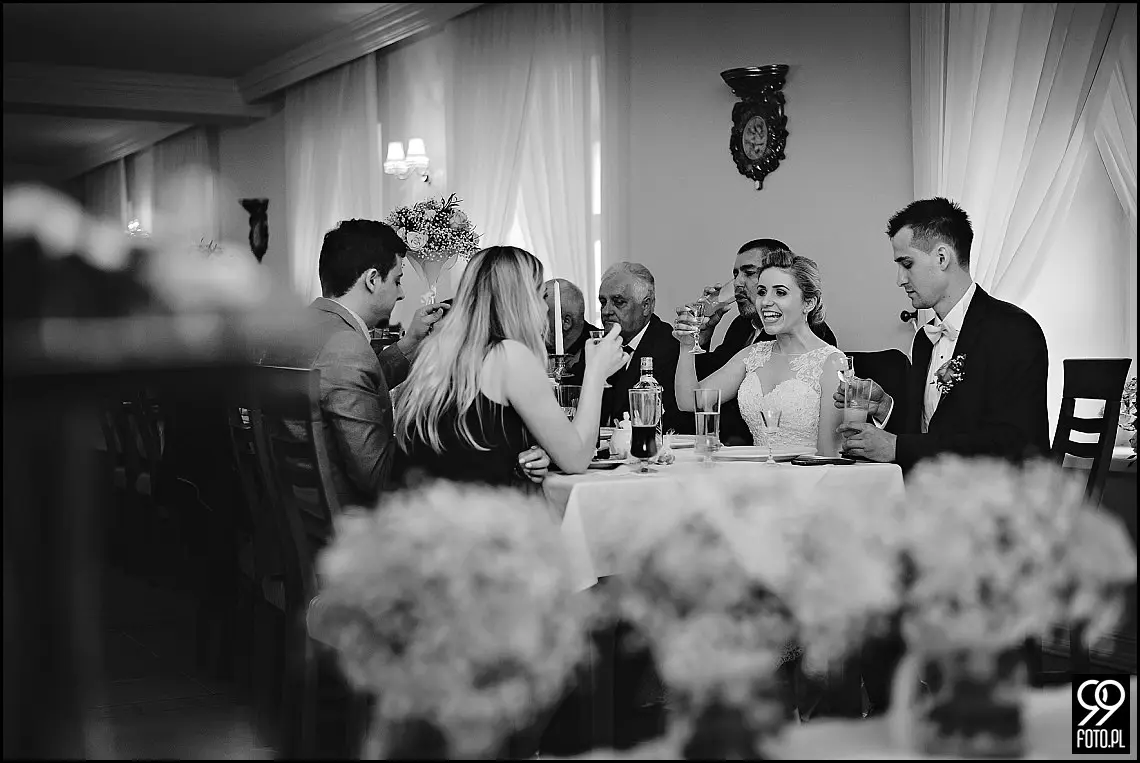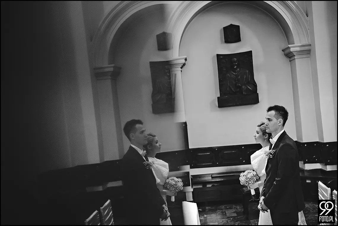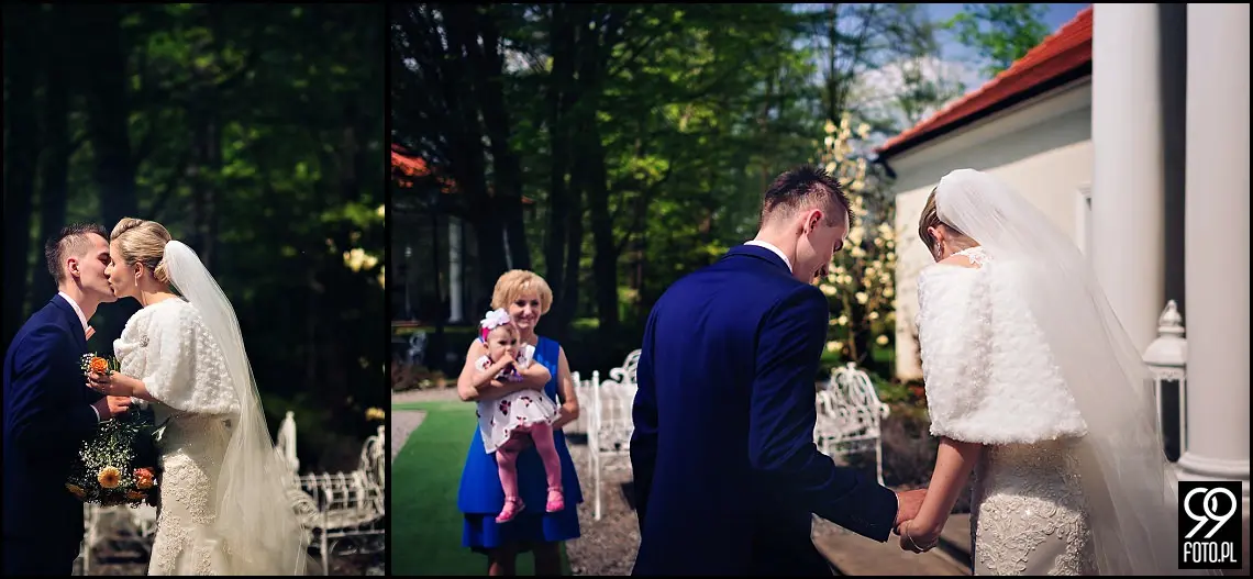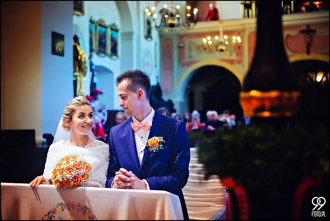 Wizażystka Ewa wykonała profesjonalny makijaż, a ja w tym czasie zdążyłem zwiedzić dworek i sfotografować ślubne detale. W ubieraniu sukni ślubnej Oli pomagała Ola, najlepsza przyjaciółka i niemalże siostra bliźniaczka. Adrianowi, kamerzyście z Kraska Wedding Studio bardzo spodobała się ksywa drugiej Oli i dzięki niej udało mu się kilka razy rozbawić dziewczyny. Po błogosławieństwie udaliśmy się do Bazyliki Nawiedzenia Najświętszej Maryi Panny w Tuchowie. Piękny kościół, który warto odwiedzić przemierzając małopolskę. Kazanie księdza kilkukrotnie wywołało uśmiech na twarzach Pary Młodej. Sakramentalne TAK, zdjęcie grupowe przy ołtarzu plenerowym i wszyscy udaliśmy się do Dworu Bistuszowa, gdzie na młodych czekał szereg atrakcji i niespodzianek. Pierwszą z nich było powitanie chlebem i solą w którym udział wzięła przebrana w staropolski strój właścicielka Dworu. Przemek otworzył drzwi lśniącego bielą Jaguara i przeprowadził Ole szpalerem wykonanym przez zaproszonych gości. Altana na moment stała się domem życzeń ślubnych, przy których nie zabrakło wzruszeń i radości. Krótki deszcz był kolejną atrakcją, która nikogo nie zaskoczyła i nadała charakteru całemu wydarzeniu. W altanie czekał już Zespół Muzyczny Hit Street, który uświetnił zabawę tego wieczoru. Plenerowa zabawa trwała do białego rana, natomiast oczepiny tego wieczoru to istne szaleństwo. W tak zwanym między czasie zrobiliśmy wspólne zdjęcia rodzinne, które są moim zdaniem równie ważne jak reportaż ślubny. Same wspaniałe wspomnienia i mam nadzieję odzwierciedlające to fotografie poniżej. Miłego oglądania, a po więcej zdjęć zapraszam do strefy klienta z hasłem z mojej wizytówki.